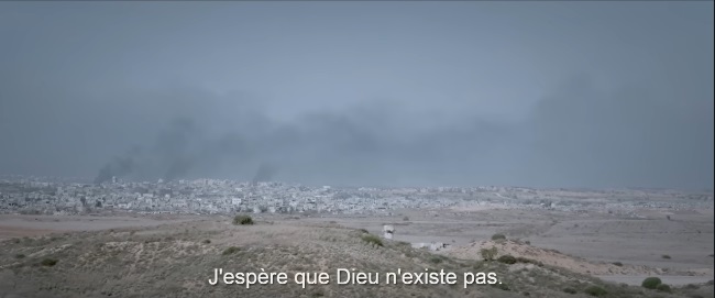 Leur périple les amène en haut d’un monticule qui a pour nom « la colline d’amour » sur lequel ils voient Gaza envahie de fumée et entendent le bruit des missiles qui tombent. C’est à ce moment que Y s’écrie : « J’espère que Dieu n’existe pas ! »