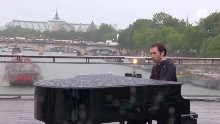 Alexandre Kantorow, quant à lui, a bravé la pluie pour être présent sur le parcours de la cérémonie. Le son qu’on entendait été enregistré aussi, mais lui était là, avec un piano trouvé dans la journée, piano médiocre qui pouvait être sacrifié sous l’eau.