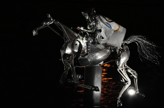 Le troisième tableau fut le plus poétique, le plus créatif, comme un conte : un cheval métallique monté par une cavalière qui apporte le drapeau olympique. Je laisse encore la parole à Patrick Boucheron :